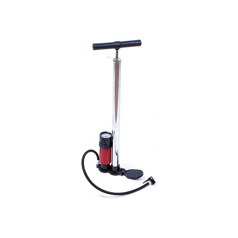 Pompe verticale à pied avec manomètre intégré, avec un réservoir compresseur limitant les efforts, usage très simple, très rapide.
